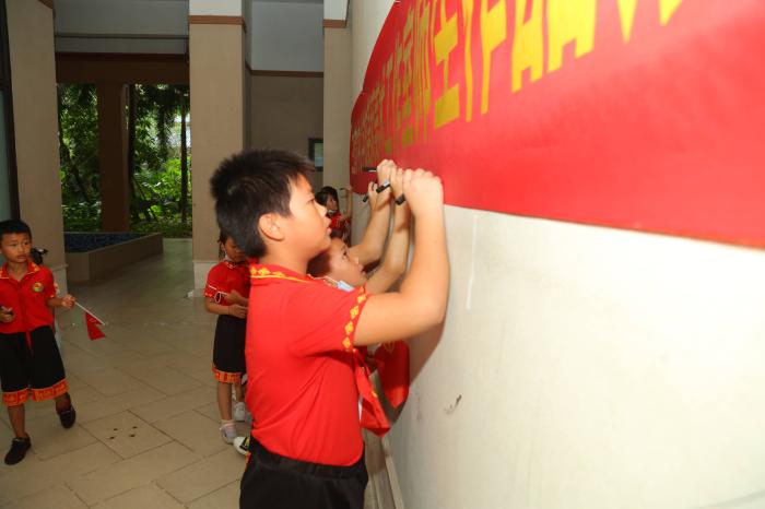 三亚市育才中心学校立足育才生态区,深挖优秀传统文化资源,打造黎,苗族优秀传统文化,积极开展“童心向党”学习教育活动,让学生听党话、感党恩、跟党走,师生用美妙的笔法画出对中国共产党、对祖国、对人民和对生活的热爱,向中国共产党建党百年献礼。