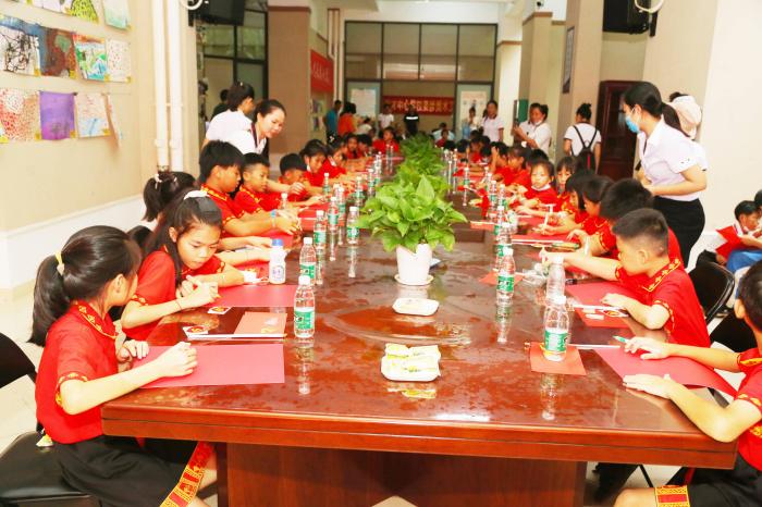三亚育才中心小学美术指导教师姜彦女士组织小学生现场作画,向党献礼