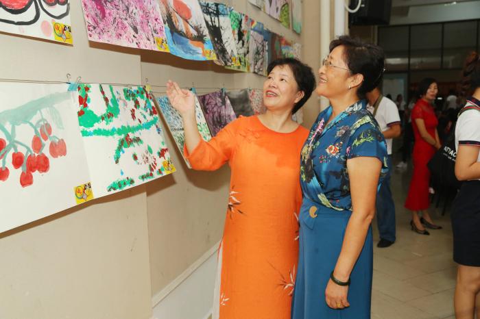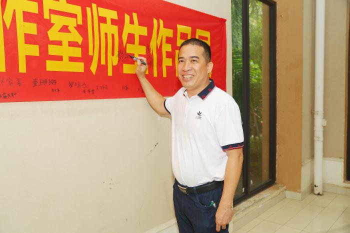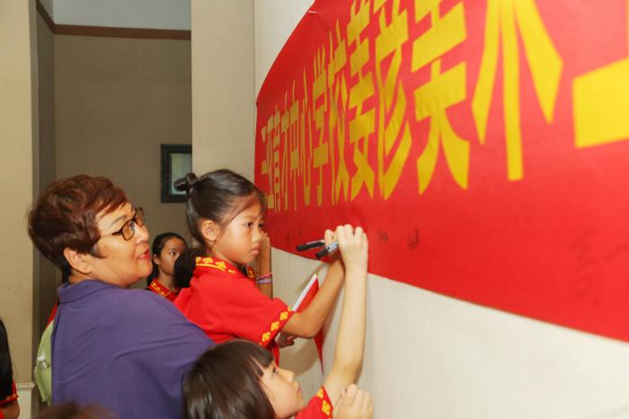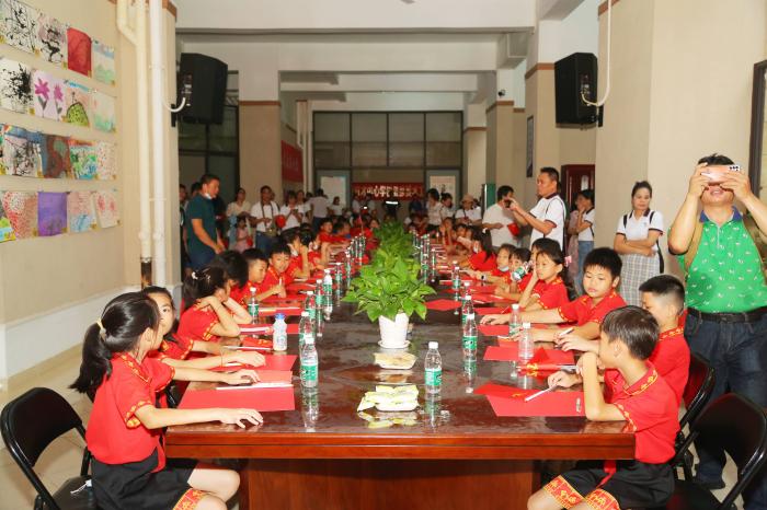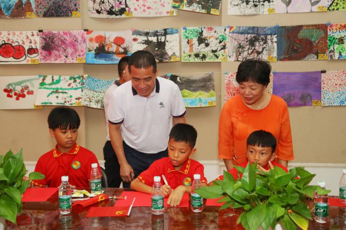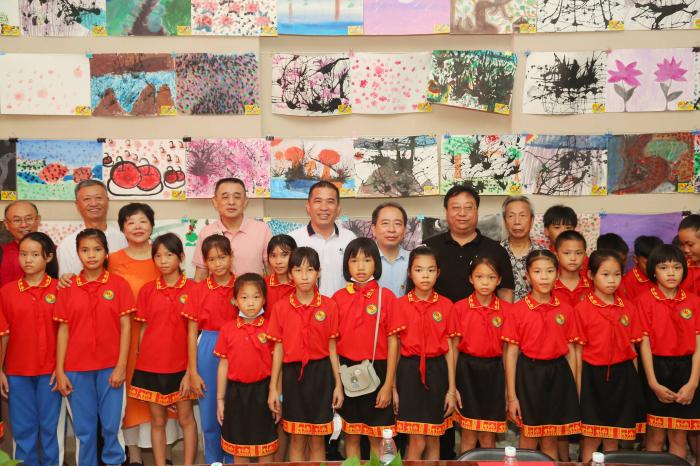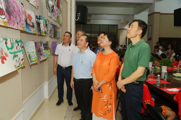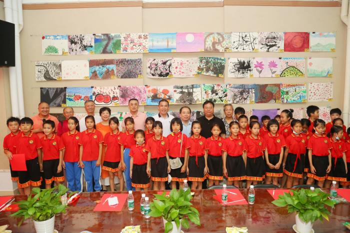 中共三亚市委宣传部一级调研员邢洪飚,三亚市文学艺术界联合会党组成员朱元水,三亚市育才中心学校校长董惠荣,海南书画艺术网副主席、三亚市育才中心学校美术指导教师姜彦,海南书画艺术网总编张波,海南书画艺术网常务副主席、君和君泰书画院院长王辉,原三亚画院院长、著名画家邹才干,三亚君和物业公司总经理姚运龙,海南书画艺术网副主席兼秘书长、三亚君和君泰美术馆馆长沙兆远、海南书画艺术网副主席、三亚君和君泰美术馆副馆长周保权先生,三亚市青年美术家协会主席、著名花鸟画家罗龙,三亚市工笔画学会会长詹冬梅,三亚宾利陶瓷总经理李丽君,三亚桑侨高尔夫学院院长龚芳,三亚市女子创业协会创建人、会长黄燕霞,海南书画艺术网副主席孙砚令,卫永明,孙燕霞、曹朝芬等书画同道于五十余位参展小学生三亚市育才中心学校教职员工一起出席了开幕式。三亚候鸟艺术沙龙副会长、书法家王黎先生发来行书作品《山娃描锦》,三亚桑侨高尔夫学院院长龚芳女士赞助价值千元室内高尔夫体验卡每人一张。中国书画院院聘书画家、国礼艺术家林新学老师寄来山水画一幅,冰雪山水画家孙燕霞老师赠送山水画一幅,共同祝贺展览成功。
