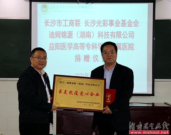 ▲益阳医学高等专科学校附属医院授予迪姆锦源(湖南)科技有限公司“最美抗疫爱心企业”称号